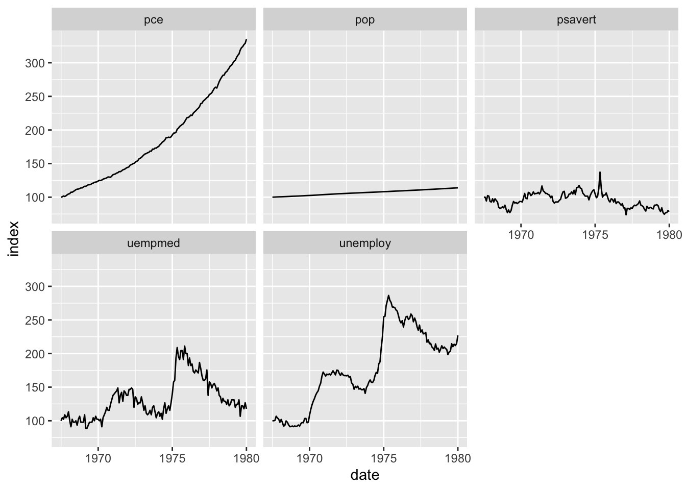 , que reúne um conjunto de séries de tempo, e indexa elas na primeira observação. Assim o primeiro valor de cada série tem valor igual a 100 e os valores subsequentes são “proporcionais” a este valor inicial.